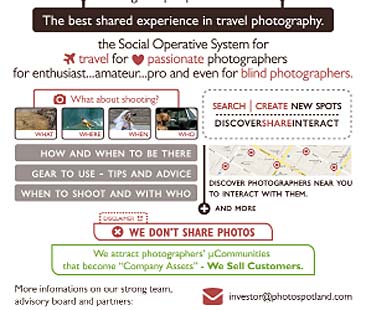 “PhotoSpotLand nasce dal riscontro di quanto le persone ormai abbiano preso gusto a condividere foto gradevoli di bei posti. Il nostro motto è “Come scattare belle foto in bei posti, con bella gente o…da soli”. L’obbiettivo è creare una community internazionale di ‘emotional photographers’ (quindi tutti coloro che amano emozionarsi scattando o guardando una foto) che possano esser in grado, con massima semplicità, di entrare in contatto per favorire e promuovere l’esperienza del fotografare. Ci rivolgiamo agli appassionati di fotografia a tutti i livelli, dai turisti fotografi agli entusiasti, agli amatori, ai fotografi professionisti. Ci siamo appassionati anche a una nicchia di settore: i fotografi ciechi che attraverso Photospotland possano trovare un utile strumento per coltivare il loro hobby”.