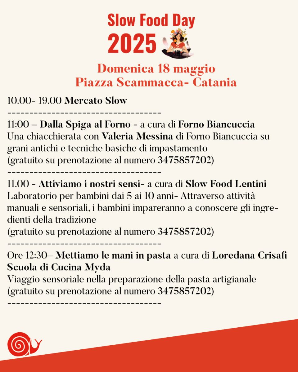 « Lo Slow Food Day è per noi un’occasione per raccontare storie di agricoltori, produttori e comunità che ogni giorno lavorano con rispetto e passione per garantire cibo buono, pulito e giusto- aggiunge Alessandro Lieto, presidente Slow Food Lentini- Per noi aderire allo Slow Food Day insieme alle condotte di Catania e Ragusa nel cuore di Catania, a Piazza Scammacca, significa costruire ponti tra città e campagna, tra tradizione e innovazione, tra chi produce e chi consuma. È una proposta culturale, educativa e conviviale che nasce dalla collaborazione tra condotte, territori e che mette al centro le persone. Inoltre, sarà anche l’occasione per raccontare e far conoscere di più il nostro patrimonio gastronomico, a partire dal pane di Lentini, dal cudduruni, olio, il riso, le arance, e tutte quelle meraviglie che il nostro territorio custodisce da generazioni. Perché ogni prodotto tradizionale è una storia di identità e resistenza che merita di essere condivisa.»