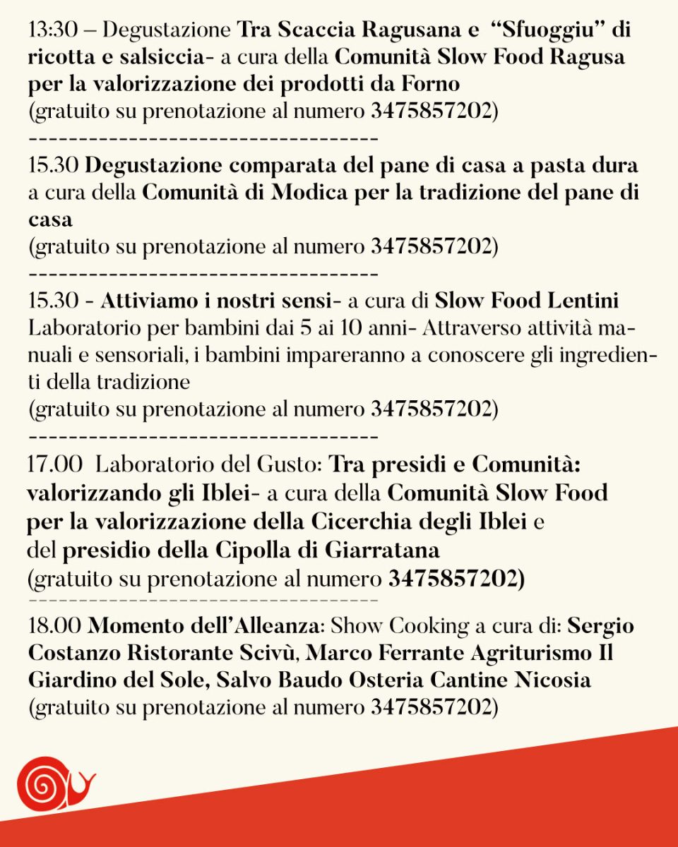 13:30 – Degustazione Tra Scaccia Ragusana e “Sfuoggiu” di ricotta e salsiccia- a cura della Comunità Slow Food Ragusa per la valorizzazione dei prodotti da Forno