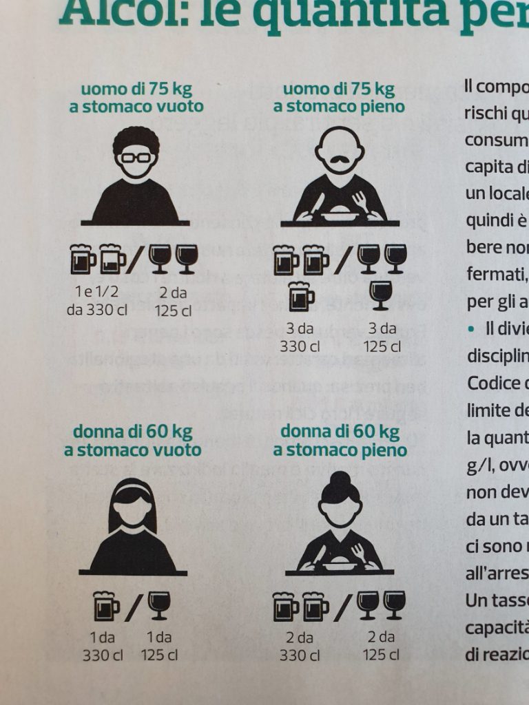Il ministero della Salute si è occupato di stilare due tabelle; la prima per la stima delle quantità di bevande alcoliche che determinano il superamento del tasso alcolemico consentito. In realtà però, i valori di alcolemia riportati lì non hanno una validità legale, rappresentano solo un’ indicazionedella concentrazione di alcol nel sangue conseguente all’assunzione di un’unità di bevanda e forniscono un valore puramente generico che non può essere in alcun modo acquisito come garanzia di sicurezza e di idoneità psico-fisica alla guida.