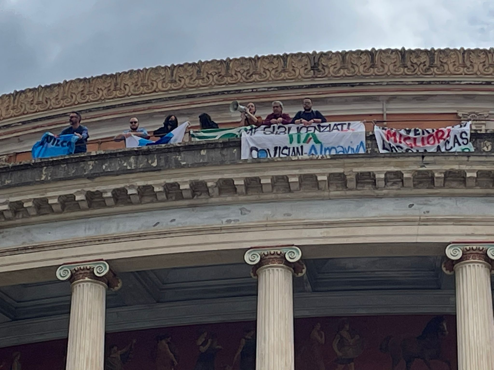 Il livello di disperazione dei lavoratori Covisian e Almaviva sale giorno dopo giorno. E così questa mattina una decina di dipendenti ha deciso di salire sul tetto del teatro Politeama a Palermo per manifestare tutta la loro rabbia.