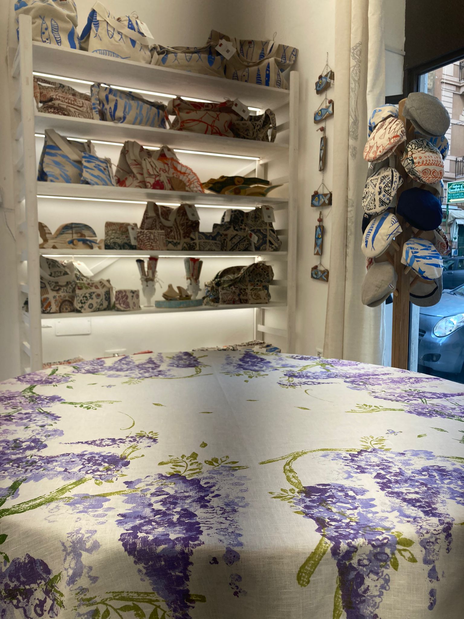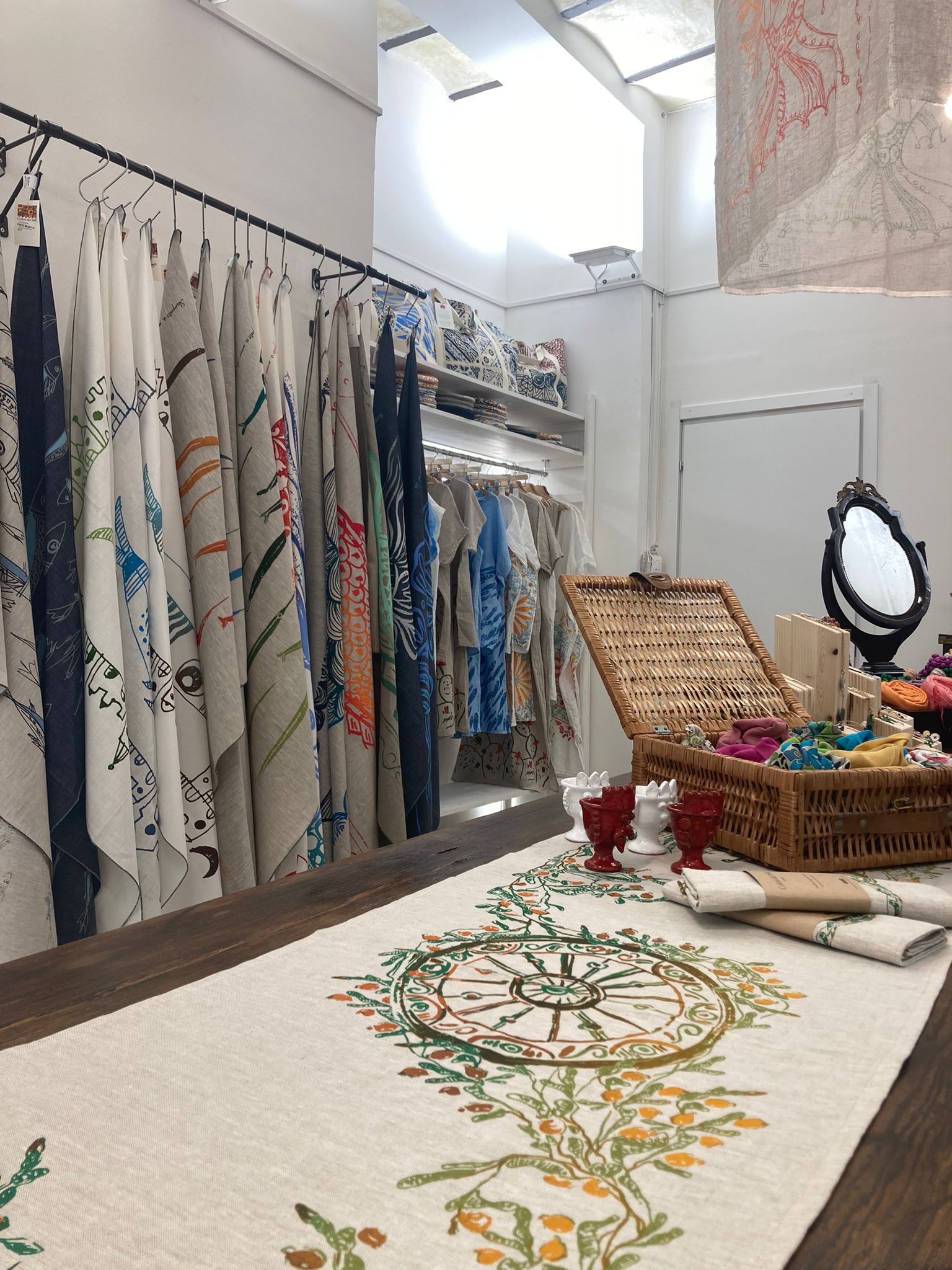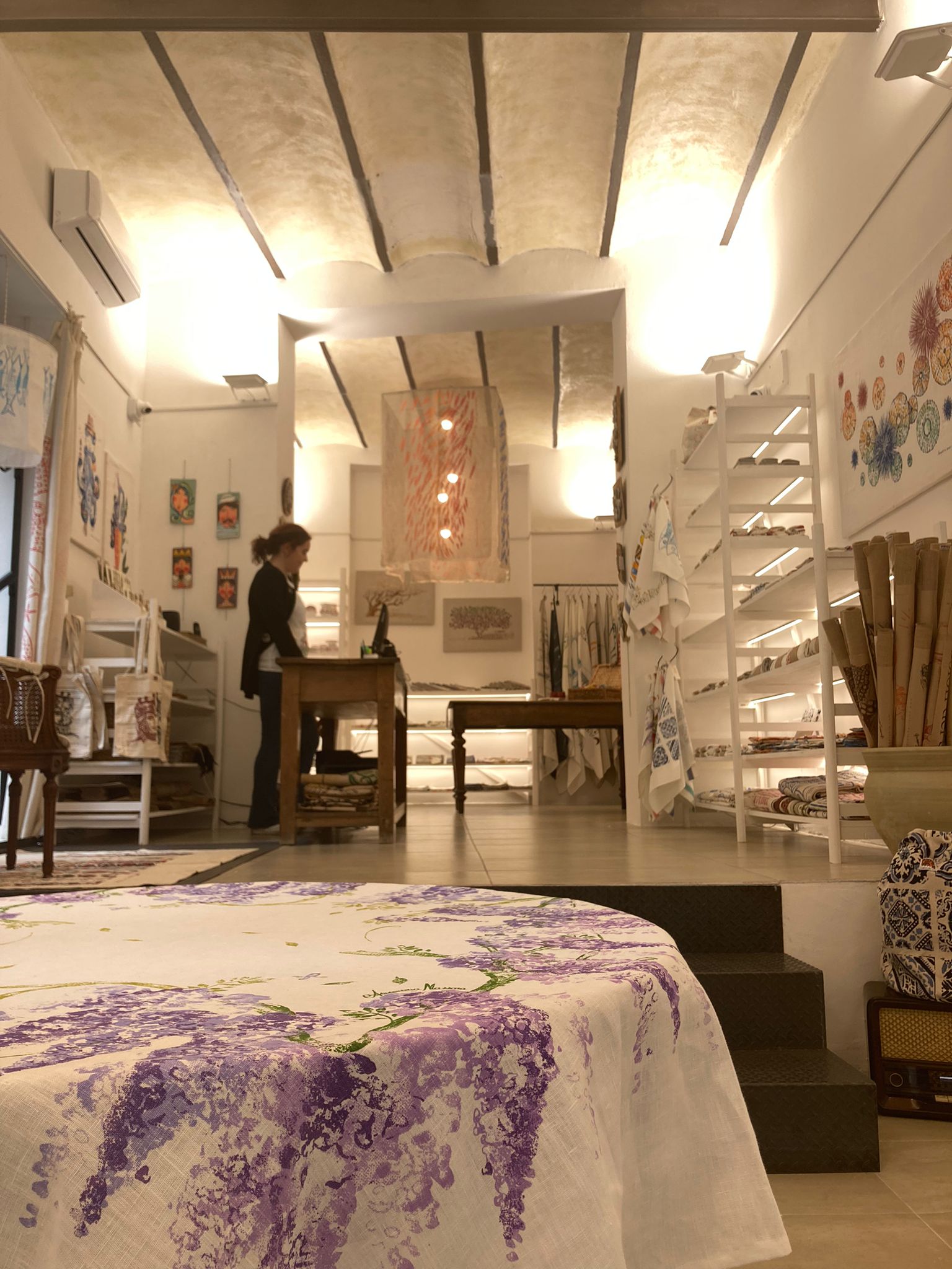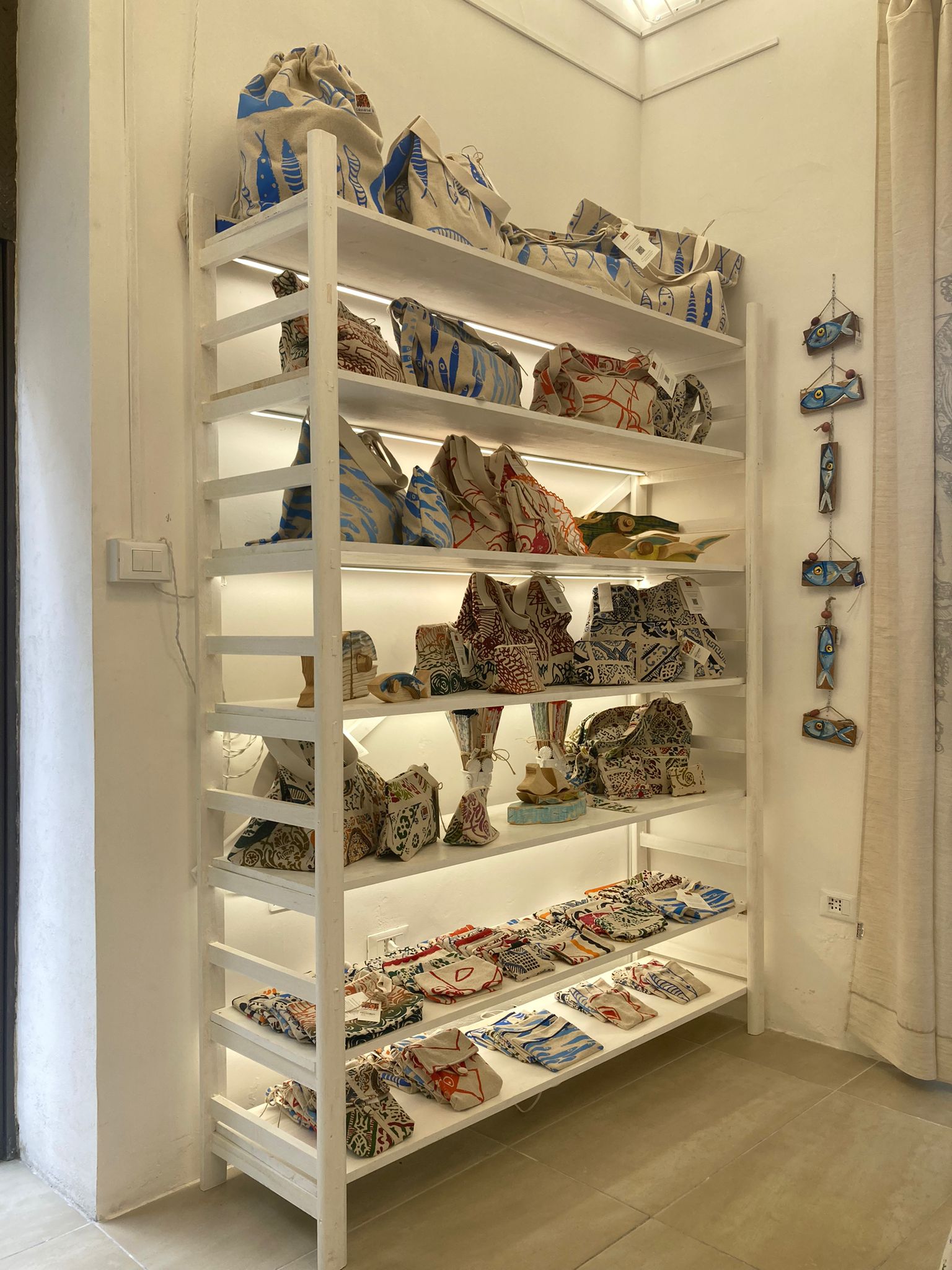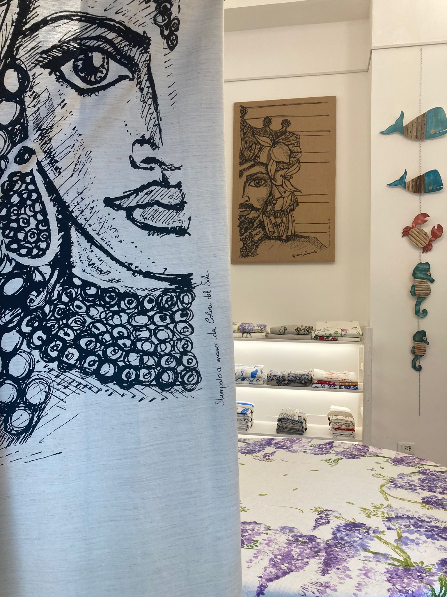 Nel nuovo store spazio ai prodotti che hanno fatto la storia dell’azienda siciliana, dai tradizionali arazzi Moro e Dama stampati a mano su Iuta naturale, fino ai nuovissimi teli d’arredo pensati in formati grandi e piccoli per arredare le pareti di casa, con illustrazioni d’ispirazione mediterranea come l’ulivo, il mandorlo, i pesci del Mediterraneo, i miti e le leggende della Sicilia come Colapesce o Re Bafè, rigorosamente stampati secondo l’arte della serigrafia artigianale, pertanto ogni pezzo è unico e irripetibile.