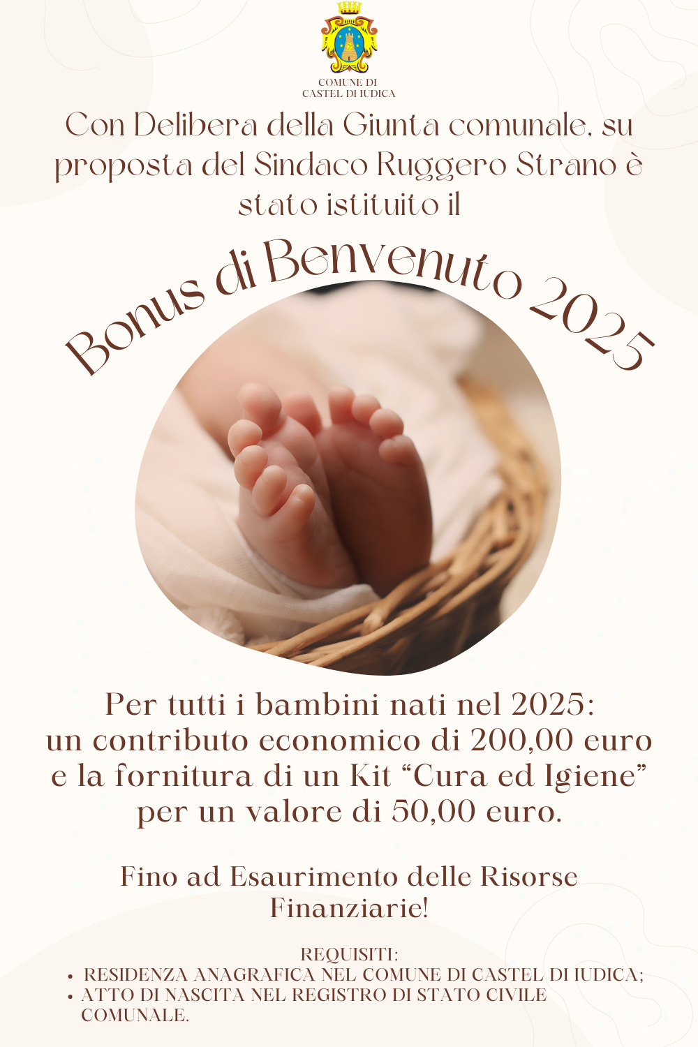 Una bella iniziativa per i cittadini di Castel Di Iudica: con delibera n. 10 del 20 Febbraio , l’amministrazione comunale ha istituito un contributo economico una tantum “Bonus di Benvenuto“ per l’anno 2025 . La somma di 200,00 euro e la fornitura di un “ kit nascita”per un valore massimo di 50,00 euro contenente prodotti per la cura e igiene , ad ogni bambino/a nato/a nel 2025 , fino all’ esaurimento delle risorse finanziarie. I requisiti per ottenerlo sono : residenza anagrafica nel Comune di Castel Di Iudica, atto di nascita nel registro di stato civile comunale ricordando , inoltre , che il bonus è cumulabile con ogni altro beneficio. Il primo cittadino Ruggero Strano dichiara : “ Questo contributo intende dare un piccolo sostegno alla natalità con un’azione concreta a beneficio delle famiglie che purtroppo, a causa della crisi, rinunciano ad avere figli, come dimostrato dal trend nascite con un decremento nel nostro comune negli ultimi tre anni . Una misura per certificare la gioia di un nuovo cittadino/a ponendo la famiglia e la maternità , al centro dell’amministrazione, da me guidata “ .