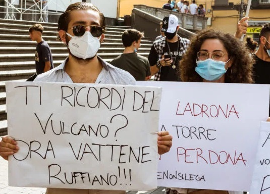Poi il comizio a Torre del Greco, gli insulti ai manifestanti di Salvini – il quale, qualche anno fa, fu condannato per razzismo per aver cantato a Pontida “Senti che puzza, scappano anche i cani, stanno arrivando i Napoletani” -, e i pomodori.