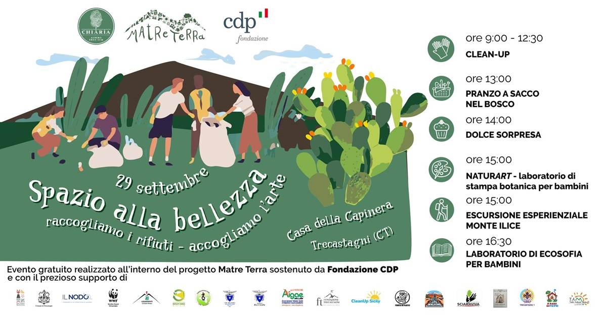 Curiamo il bosco per far posto all’arte. Si chiama, non a caso, Spazio alla bellezza – raccogliamo i rifiuti – accogliamo l’arte il grande evento di rimozione dei rifiuti nei boschi intorno alla Casa delle Capinera (Trecastagni) in programma per domenica 29 settembre nell’ambito del progetto Matre Terra che, promosso da Chiarìa Aps e sostenuto da Fondazione CDP, prevede la realizzazione sull’Etna di un sentiero di land art che ai rifiuti sostituirà opere d’arte dedicate alla sacralità della Natura.