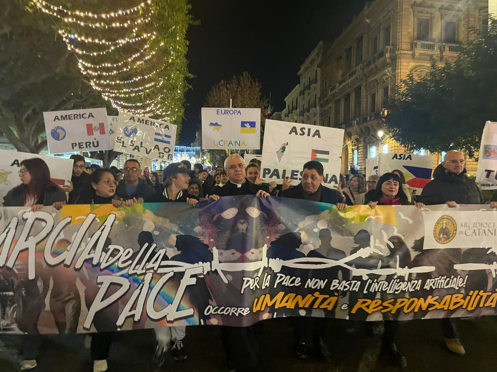 L’iniziativa, ispirata dal messaggio di Papa Francesco sul tema “Intelligenza artificiale e pace”, ha preso il via dalla chiesa di sant’Agata al Borgo e si è snodata per via Etnea fino a Piazza Duomo.