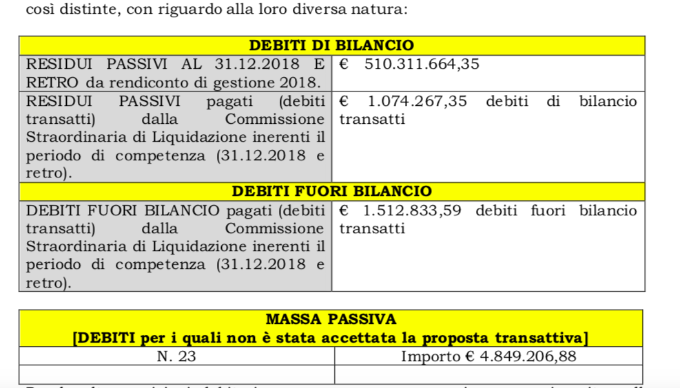 Come prima cosa, dunque, l’Organismo ha dovuto procedere alla rilevazione dell’intero ammontare del debito maturato da Palazzo degli Elefanti. Al 31 dicembre 2018, la massa passiva ammonta a 574.311.632 euro e le posizioni debitorie sono 2.315.