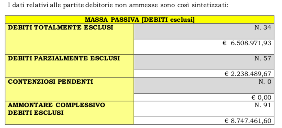 Coloro che non hanno accettato la transazione dovranno essere liquidati interamente. Per farlo, l’Organismo straordinario di liquidazione deve accantonare il 50% del debito, elevato al 100% per i debiti privilegiati. “Per farvi fronte, deve procedere con gli accantonamenti, nelle percentuali di legge, per i debiti non transatti”. I debiti esclusi sono 91 in totale, per un ammontare di 8.747.461 euro.