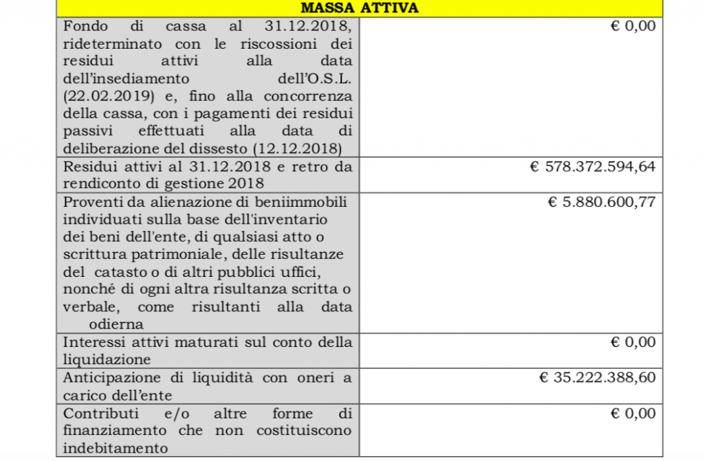 Un lavoro che ha prodotto la determinazione della massa attiva che vede, tra le altre voci, 578.372.594 euro di residui attivi e 5.880.600 euro provenienti da alienazione di immobili.