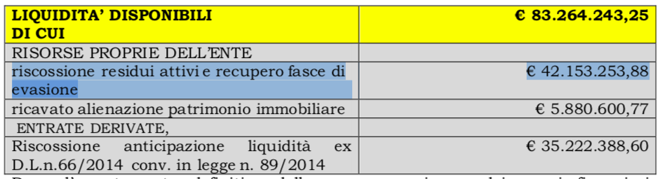 “Sul conto speciale aperto presso l’Istituto Tesoriere sono confluite tutte le somme incassate dal giorno successivo alla data di dichiarazione di dissesto, a valere sulla gestione dei residui attivi, nonché da alienazioni patrimoniali ed interessi attivi”. La liquidità dell’ente ammonta a 83.264.243 euro, di cui ben 42.153.253 euro provenienti da riscossione residui attivi e recupero fasce di evasione.