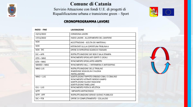 Svelato il cronoprogramma dei lavori che comunque, è stato chiarito, è passibile di eventuali aggiornamenti. Già ultimati i lavori di sostituzione della grondaia e della nuova impermeabilizzazione del tetto per porre rimedio alle infiltrazioni d’acqua oltre alle opere di ripristino degli scarichi fognari, si sta attualmente lavorando sulla ristrutturazione del piano 3 della Tribuna A (uffici, tribuna stampa e box sponsor) e del piano T (area spogliatoi, comprensiva del rifacimento degli spogliatoi locali, ospiti e arbitri e hall). Iniziati anche gli interventi sul Cibalino, l’impianto presente alle spalle del Massimino: in questo caso si parla di sostituzione del manto erboso. Il periodo probabilmente più delicato, sotto il profilo degli interventi, sarà quello estivo. Per consentire, infatti, il regolare svolgimento delle gare interne del Catania al Massimino, una parte dei lavori è stata concentrata proprio nel periodo di pausa della stagione sportiva. È prevista nei mesi tra maggio e luglio la ristrutturazione delle tribune con la rimozione dei vecchi seggiolini e l’installazione dei nuovi anche nei settori dove in precedenza questi non erano presenti (due mesi almeno per la realizzazione), il rifacimento delle vetrate a bordo campo, la sostituzione delle panchine e la posa del nuovo tabellone luminoso che rimpiazzerà quello già esistente ma di fatto inutilizzabile ormai da anni. Particolare la questione legata al rifacimento del manto erboso dove, su espressa richiesta del Catania, si è modificato il piano d’azione: se prima era prevista la posa di un manto erboso misto naturale-erba sintetica, adesso è in programma l’installazione di un manto interamente in erba naturale. Sempre in estate è previsto poi il retopping della pista d’atletica: l’obiettivo è rendere accessibile e utilizzabile l’impianto entro l’inizio della nuova stagione, che vedrà il Catania di scena nel campionato di Serie C. A stagione già iniziata, invece, si prevede di portare a termine gli ultimi lavori, dall’impianto antincendio alla ristrutturazione dei servizi igienici fino alle opere di completamento collaudo (previste tra dicembre e giugno 2024)