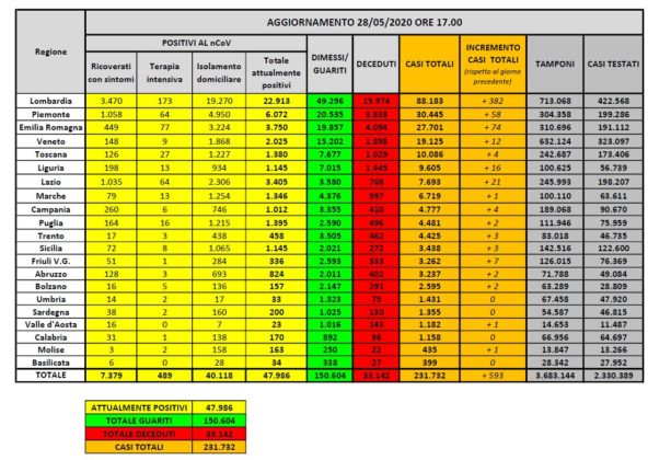 Rispetto al 27 maggio i deceduti sono 70 e portano il totale a 33.142. Il numero complessivo dei dimessi e guariti sale invece a 150.604, con un incremento di 3.503 persone rispetto al 27 maggio.