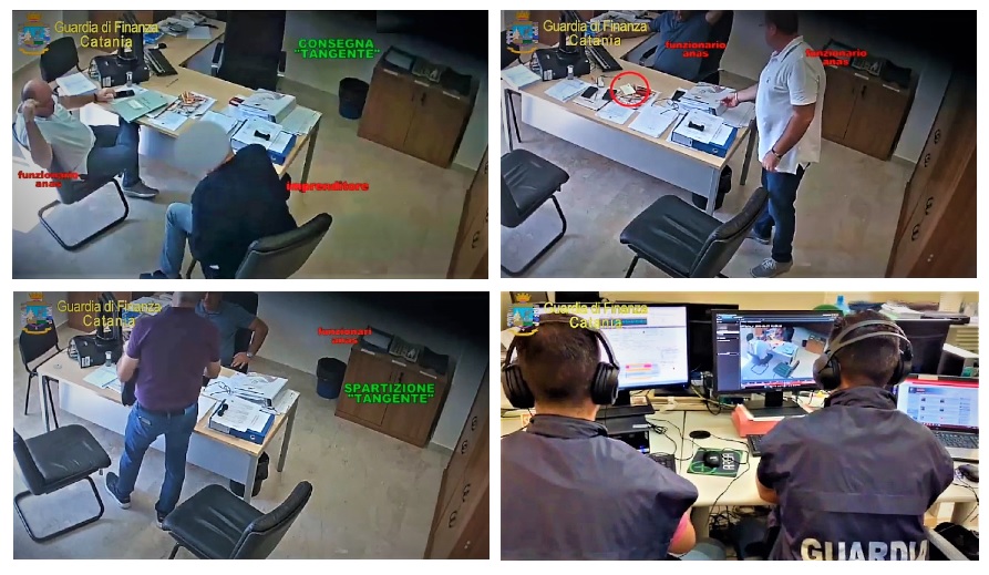 In foto e filmati diffusi dalla Finanza si vedono i tre non appena hanno ricevuto e si sono divisi diecimila euro consegnati negli uffici dell’Anas di Catania da un imprenditore nisseno.