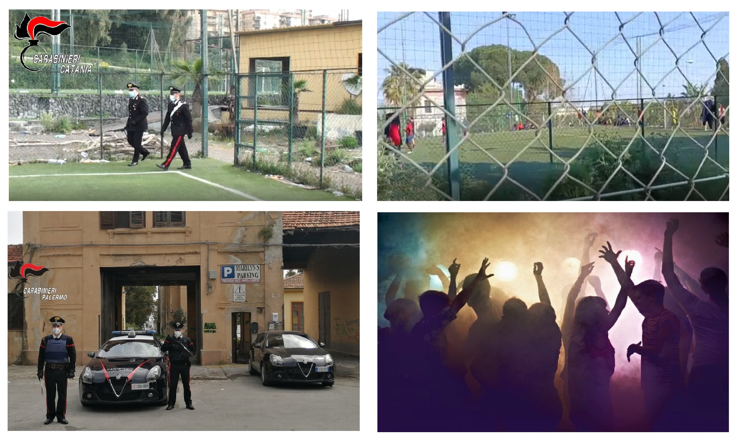 Tra gli episodi più eclatanti, quello dei “Furbetti del calcetto” di Catania: una partita con numerosi spettatori è stata interrotta dai Carabinieri, che, sempre nella città etnea, hanno fatto irruzione durante una festa di compleanno in un bar: il loro arrivo ha provocato un fuggi fuggi generale.