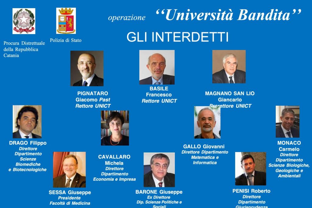Le dieci misure interdittive della Digos di Catania sono state eseguite nei confronti, oltre che del rettore Basile e dell’ex Giacomo Pignataro, anche a carico del pro rettore, Giancarlo Magnano di San Lio, e dei direttori di Dipartimento Michela Cavallaro (Economia), Giovanni Gallo (Matematica), Carmelo Monaco (Scienze Biologiche), Filippo Drago (Medicina) e Roberto Pennisi (Giurisprudenza). Sospesi anche Giuseppe Sessa (presidente del Coordinamento della Facoltà di Medicina) e Giuseppe “Uccio” Barone (ex direttore del Dipartimento di Scienze Politiche).