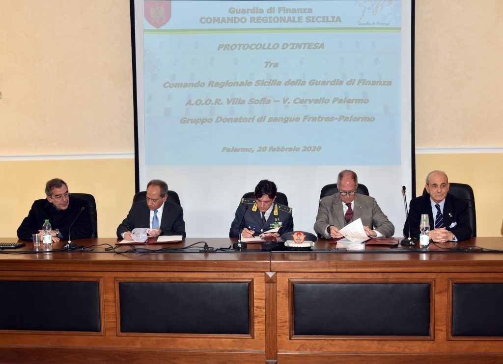 PALERMO – Questa mattina, nella Sala Conferenze della Caserma “S. Ten. M.O.V.M. Giuseppe Cangialosi”, il Direttore Generale dell’Azienda Ospedaliera “Ospedali Riuniti Villa Sofia – V. Cervello” di Palermo – Walter Messina, il Comandante Regionale Sicilia della Guardia di Finanza – Gen.D. Riccardo Rapanotti ed il Presidente dell’Associazione “Gruppo donatori di sangue Fratres-Palermo Odv” – Roberto Grippi, hanno siglato un protocollo d’intesa finalizzato a diffondere la cultura della donazione e incrementare la raccolta di sangue tra i finanzieri dei Reparti della provincia di Palermo e i loro familiari.
