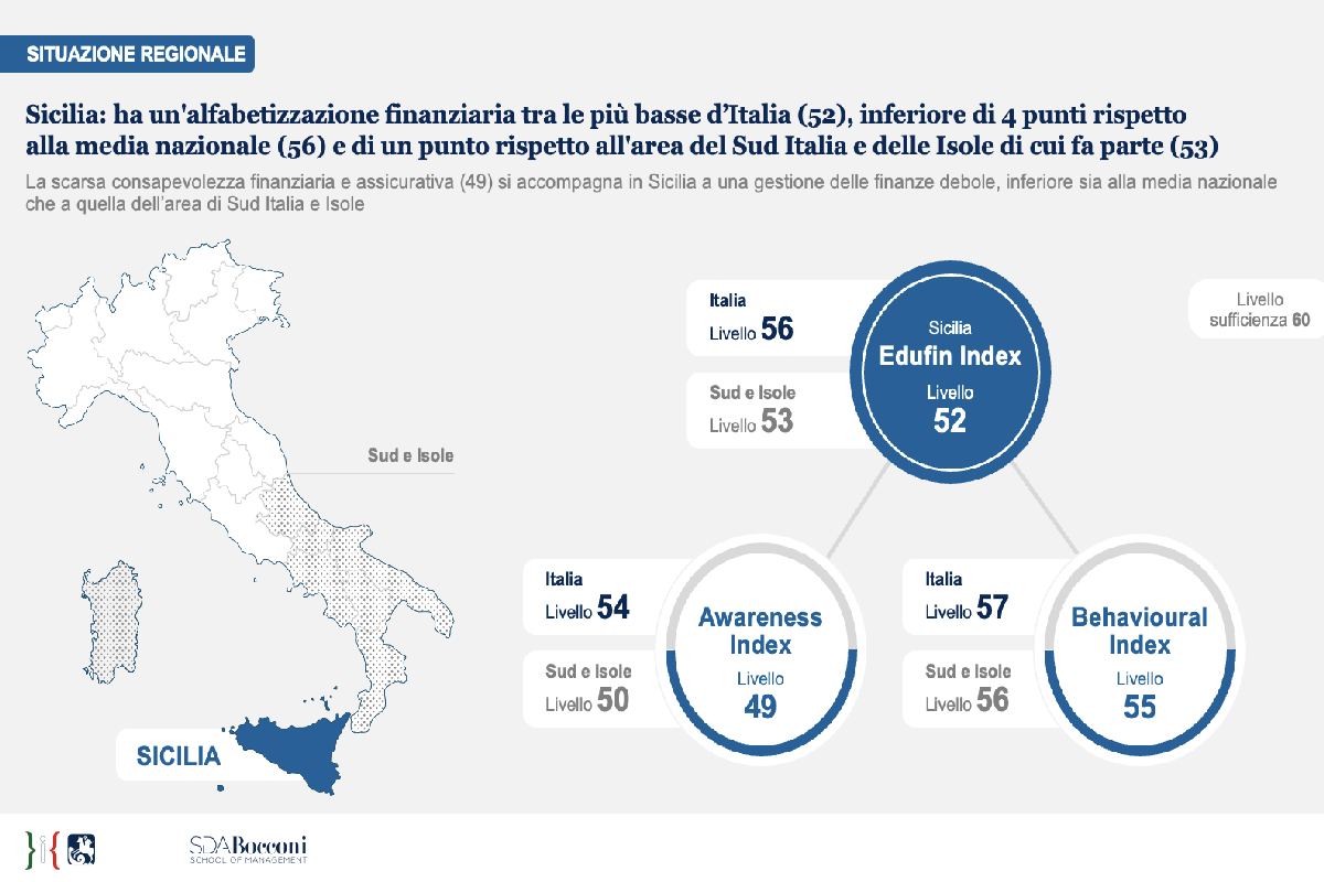 Dall’Edufin Index 2024 emerge che la Sicilia è tra le regioni più lontane dalla sufficienza (52 vs 60), con valori inferiori di un punto rispetto alla media del Sud e delle Isole. Ad esempio, la consapevolezza dei siciliani sui temi finanziari e assicurativi (Awareness Index)è appena più bassa di quella attribuita al Meridione e alle regioni insulari (49 vs. 50). Lo stesso avviene per i comportamenti nella gestione delle finanze (Behavioural Index), dove la Sicilia risulta essere di poco più indietro rispetto alla macroarea Sud e Isole (55 vs 56).