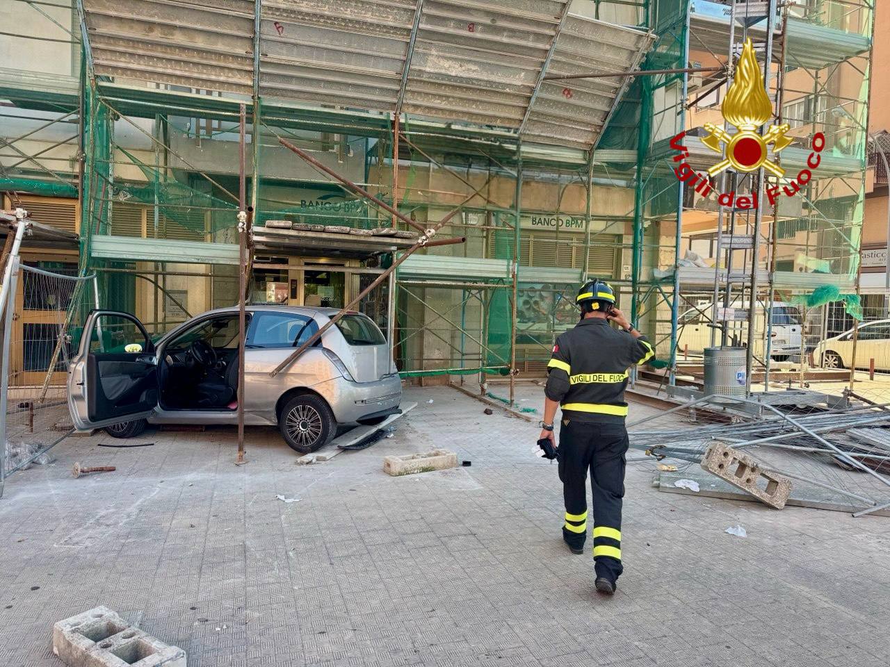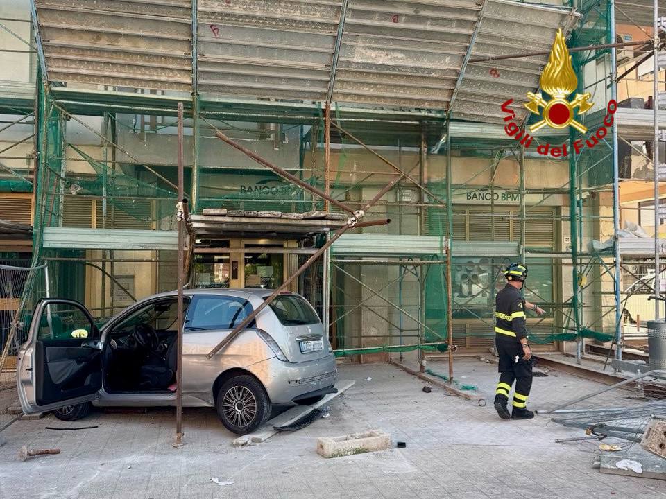 L’auto ha divelto alcune colonnine salendo sul marciapiede e poi contro il ponteggio sull’ingresso dell’istituto di credito.