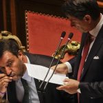 Italian Premier Giuseppe Conte addresses the Senate as Deputy-Premier Matteo Salvini kisses a rosary while sitting beside him, in Rome, Tuesday, Aug. 20, 2019. Italian Premier Conte blasted the League’s leader Salvini for his decision to spark a government crisis that risks triggering “a spiral of political and financial instability.” (ANSA/AP Photo/Gregorio Borgia) [CopyrightNotice: Copyright 2019 The Associated Press. All rights reserved]