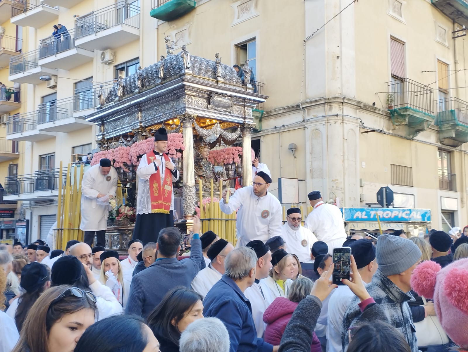 Ore 8.25: Il fercolo di Sant’Agata sta risalendo via Dusmet. Superato il primo degli altarini, dove si possono lasciare doni per la Patrona.
