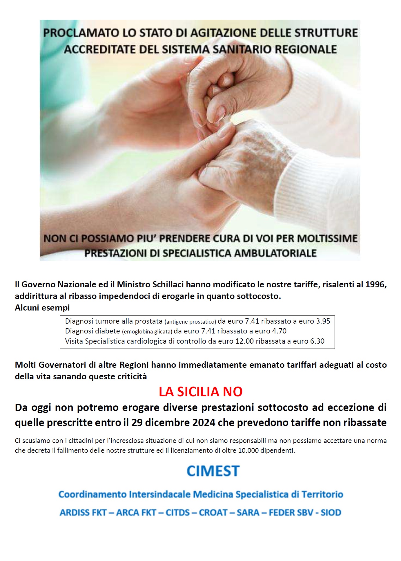 Il Cimest (Coordinamento Intersindacale Medicina Specialistica di Territorio) ha proclamato lo stato di agitazione e chiede un incontro urgente con il Presidente della Regione Siciliana, Renato Schifani oltre alla contestuale apertura di un tavolo di crisi per cercare e trovare soluzioni concordate al fine di poter uscire dal “famigerato” Piano di Rientro che blocca ogni azione del Governo volta alla soluzione dell’adeguamento tariffario al pari delle altre regioni italiane.