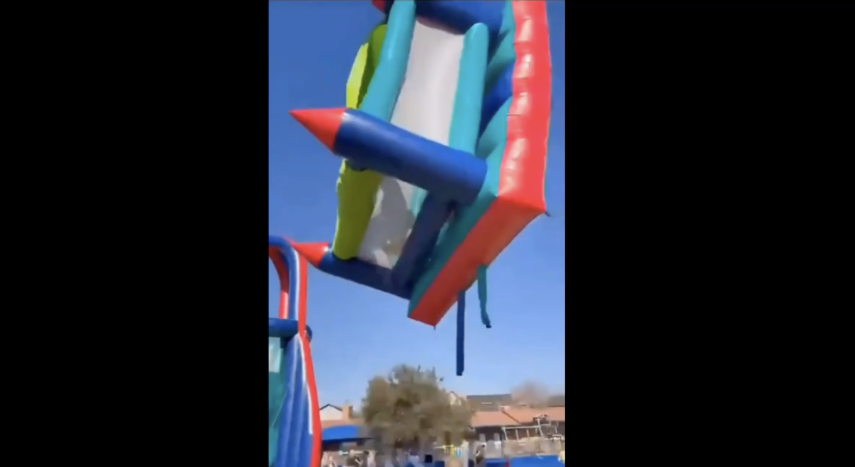 Il gonfiabile, alto circa dieci metri, si inclina pericolosamente mentre due bambini precipitano nel vuoto. Attorno, adulti in preda al panico corrono per cercare di afferrarli e metterli in salvo.