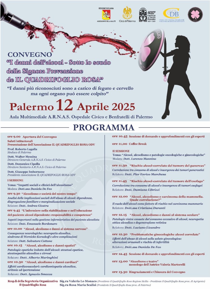 Sabato 12 aprile con inizio alle ore 9:00, presso l’Aula Multimediale A.R.N.A.S. Ospedale Civico e Benfratelli di Palermo, si terrà il Convegno medico dal titolo “I danni dell’alcol: sotto lo scudo della Signora Prevenzione” organizzato dall’Associazione Il Quadrifoglio Rosa odv.