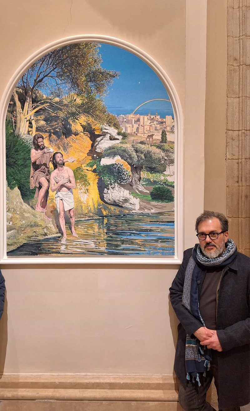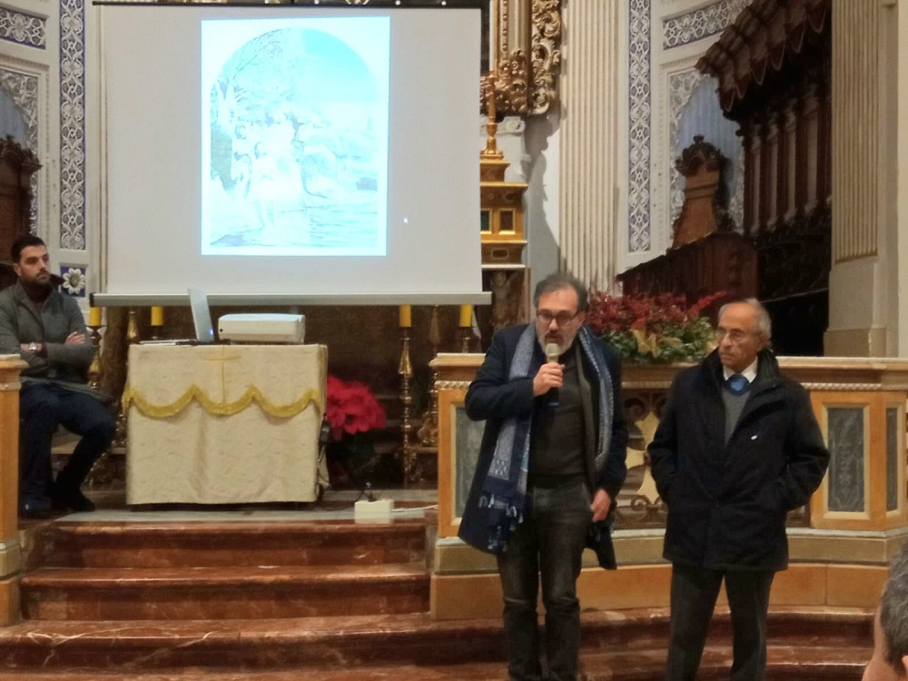 L’excursus storico è servito a delineare la peculiarità dell’opera di Iudice. “La sua cifra stilistica – spiega Nifosì – è la luminosità, il disegno che si trasforma in pittura. La rappresentazione di opere di edilizia civile moderna inserite nel paesaggio, la presenza della chiesa Madre di Comiso, ma anche del rudere di un tempio antico, dell’ulivo e dei cespugli tipici del paesaggio mediterraneo, sono elementi che si completano e che restituiscono un’opera veramente interessante. L’arte è sempre contemporanea e si inscrive nel periodo storico in cui essa nasce”. Iudice ha spiegato brevemente le scelte compiute: “Ho rappresentato un paesaggio che richiama il Giardino della Kolymbethra di Agrigento. Sono andato alla ricerca di uno sfondo dal sapore antico, inserendo in questo contesto un’immaginaria città con edifici di edilizia moderna. Sono contento di avere realizzato questo lavoro con una autonomia iconologica rispetto alla tradizione. Questo ha consentito il rinnovamento dell’immagine che comunque ha rispettato la coerenza dell’edificio sacro che la ospita”.Iudice ha ringraziato l’associazione “Ad Sidera”: “Mi hanno consentito di lavorare con libertà” e gli amici, Corrado Inturri e Luigi Domicoli, “che si sono prestati a fare da modelli, dando il loro volto rispettivamente per Giovanni Battista e per Gesù”.