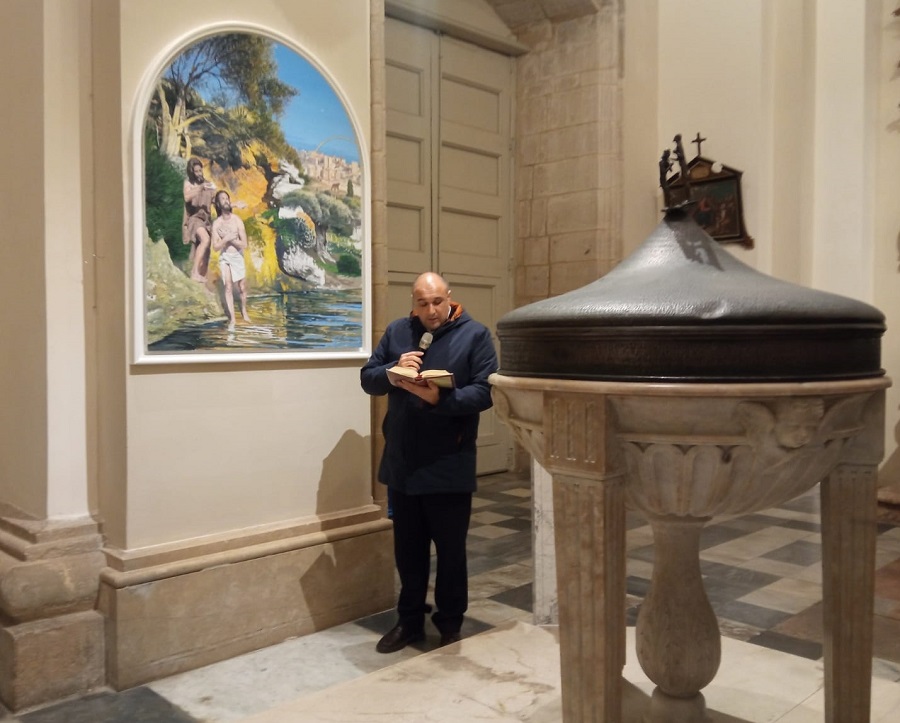 “Il Battesimo di Gesù”, opera del pittore gelese Giovanni Iudice nella Chiesa Madre di Santa Maria delle Stelle a Comiso, è stato inaugurato domenica sera. Ha trovato posto nella parasta accanto al fonte battesimale. Il dipinto con forma centinata, della misura di cm 150×120, è stato posto nello stesso spazio che fino a circa 50 anni ospitava un altro “Battesimo di Gesù”, del comisano Giuseppe La Leta, pittore sordomuto, andato poi perduto. Erano presenti il parroco, don Innocenzo Mascali, il vicario generale don Roberto Asta, il presidente dell’associazione culturale “Ad Sidera”, che ha commissionato l’opera donandola alla parrocchia, Dario Brafa, il sindaco, Maria Rita Schembari, il deputato regionale Giorgio Assenza (anch’essi soci di “Ad Sidera”).