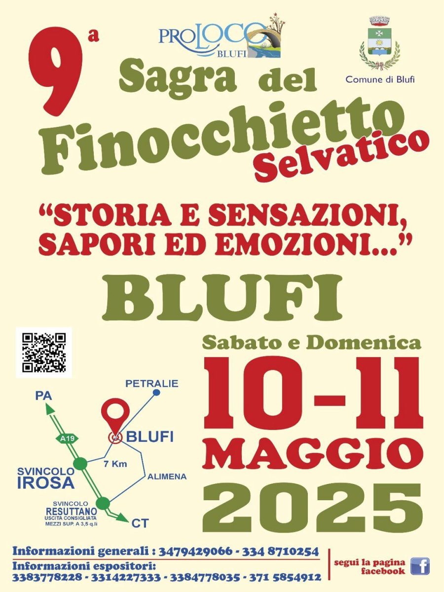 La Sagra del finocchietto selvatico di Blufi, giunta alla sua nona edizione, coinvolge ogni anno l’intera comunità blufese: fin dalla raccolta e dalla pulitura del finocchietto selvatico, che avviene a fine aprile, associazioni, rappresentanti di enti ed istituzioni, e cittadini di ogni età si adoperano per organizzare un evento che mira a fare conoscere bellezza, tradizioni e sapori di questo piccolo borgo nel cuore delle Madonie.