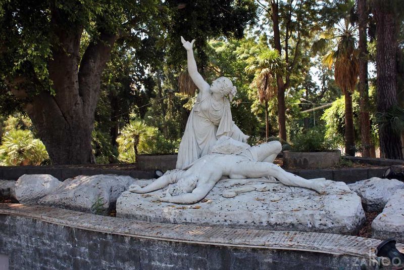 La vicenda narra di Polifemo, ciclope che abita l’Etna, innamorato della giovane Galatea, una bellissima ninfa figlia delle divinità marine. Aci, invece, è un pastore, figlio di Fauno, e ama pascolare le sue pecore vicino al mare. Un giorno incontra Galatea e se ne innamora perdutamente. Il legame tra i due giovani è molto forte e per questo i tentativi di corteggiamento del ciclope erano tutti inutili. Una sera, al chiarore della luna, Polifemo vede gli innamorati baciarsi in riva al mare e accecato dalla gelosia scaglia un grosso masso contro il pastorello, uccidendolo. Galatea piange tutte le sue lacrime sopra il corpo martoriato di Aci e così Giove e gli dèi, impietositi, trasformano il sangue del ragazzo in un piccolo fiume che nasce dal vulcano e sfocia nel tratto di spiaggia proprio dove i due amanti si incontravano.