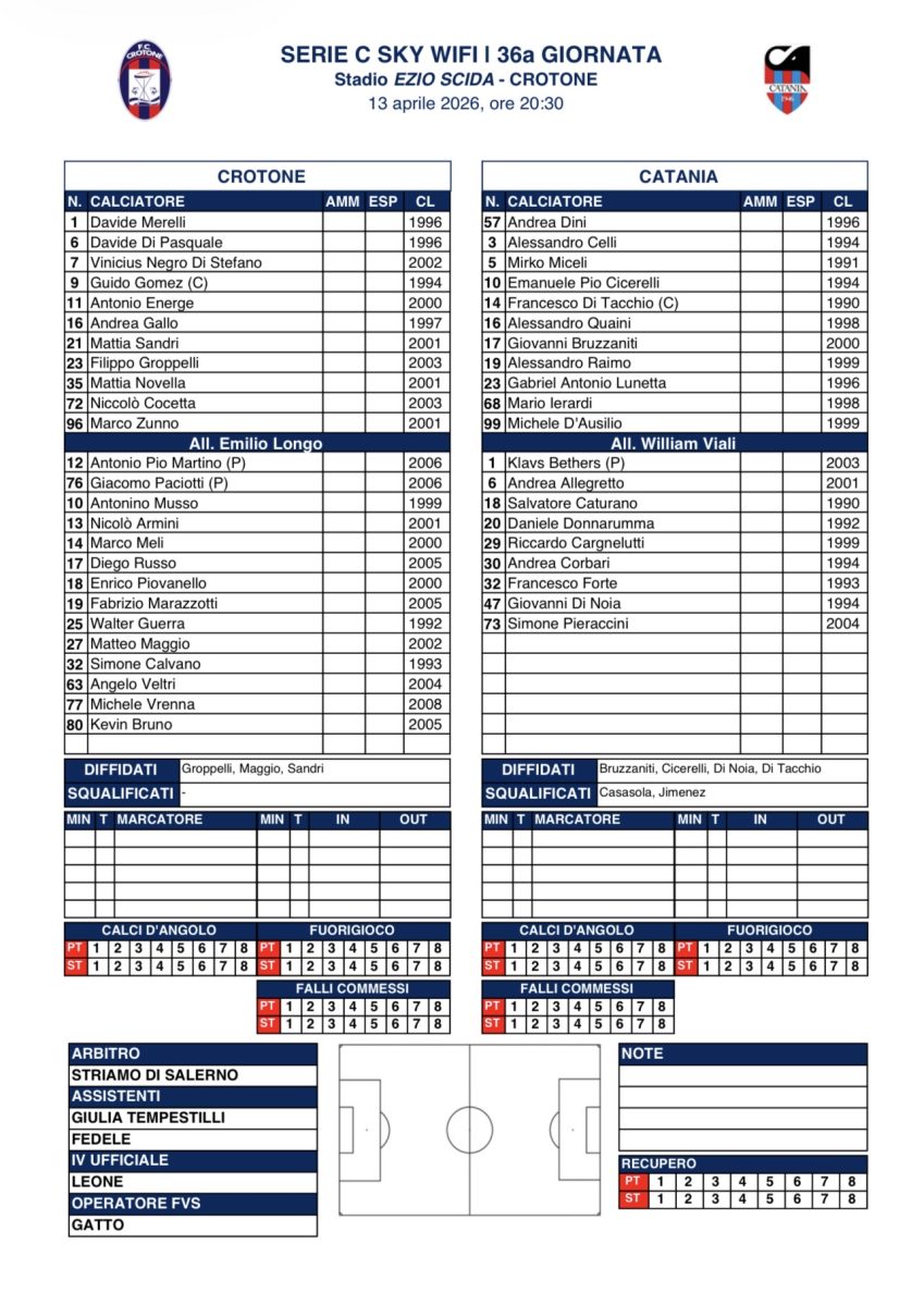 CROTONE (4-3-3): Merelli; Novella, Cocetta, Armini, Guerra; Gallo, Vinicius, Sandri; Energe, Gomez, Zunno. All. Longo