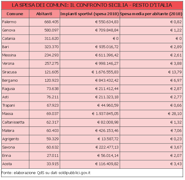 PALERMO – Quanto spendono i Comuni siciliani per gli impianti sportivi? Poco e, in alcuni casi, addirittura nulla. Nel 2018, stando ai dati riportati dal sito soldipubblici.gov, che monitora la spesa della Pubblica amministrazione, i nove capoluoghi siciliani hanno destinato all’impiantistica poco più di 3 milioni e 200 mila euro, per una spesa pro capite di appena 2 euro. Se si guarda ai singoli Municipi, la situazione appare ancor più drammatica. Buona parte dell’ammontare totale, infatti, arriva da un unico Comune virtuoso: Siracusa, che da solo ha speso un milione e 670 mila euro. Per il resto, quasi solo spiccioli un po’ in tutta l’Isola fino al caso limite di Catania, dove la spesa attestata dalla piattaforma è addirittura di zero euro.