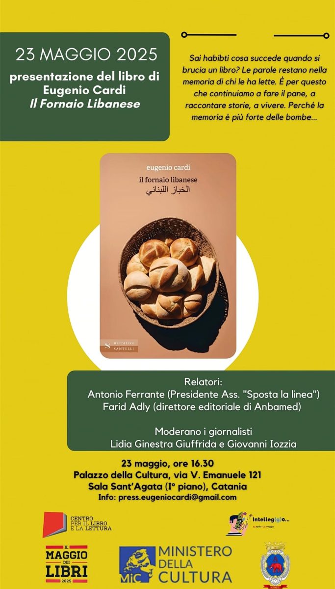 “Il fornaio libanese”, dodicesimo romanzo dello scrittore Eugenio Cardi, residente a Roma, è un romanzo di Resistenza, femminista e antifascista. In libreria dal 7 maggio 2025 per Santelli Editore (distribuito da Messaggerie Libri), nell’ambito della campagna nazionale di promozione della lettura denominata “Il Maggio dei Libri”, edizione 2025, il romanzo di Cardi verrà presentato: a Palermo, nella splendida cornice di Villa Trabia, il prossimo 22 maggio (ore 17), relatori: Prof. Charlie Barnao (Università degli Studi di Palermo), dott. Antonio Ferrante (Presidente Ass.ne “Sposta la linea”) e a Catania nello storico Palazzo della Cultura il 23 maggio (Sala S. Agata, ore 18), relatori: Antonio Ferrante, Farid Adly (Direttore Editoriale Anbamed), moderano i giornalisti Lidia Ginestra Giuffrida e Giovanni Iozzia.