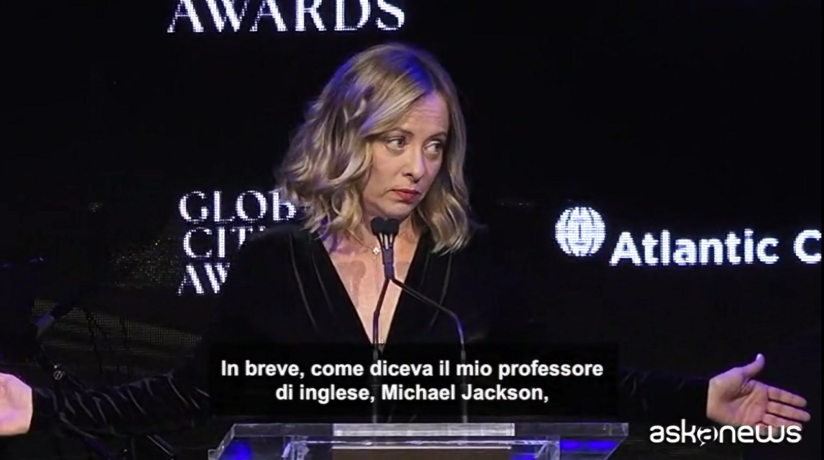Giorgia Meloni da New York cita Michael Jackson e canta un accenno di “Man in the mirror” durante il discorso di ringraziamento per la consegna del premio “Global Citizen Award 2024” dell’Atlantic Council, consegnatole da Elon Musk.