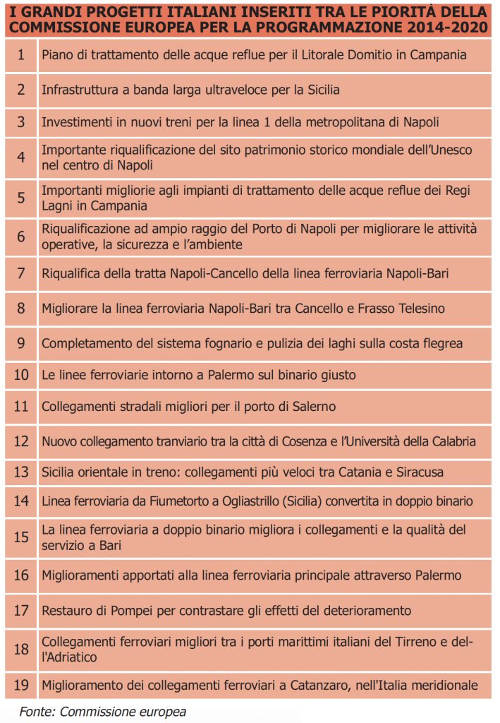 Per la Programmazione 2014-2020 sono stati 19 i grandi progetti italiani rientranti nell’elenco sopra menzionato. Tra questi anche alcuni che riguardano direttamente la nostra Isola: “Infrastruttura a banda larga ultraveloce per la Sicilia”; “Le linee ferroviarie intorno a Palermo sul binario giusto” ; Sicilia orientale in treno: collegamenti più veloci tra Catania e Siracusa”; “Linea ferroviaria da Fiumetorto a Ogliastrillo convertita in doppio binario”; “Miglioramenti apportati alla linea ferroviaria principale attraverso Palermo”.