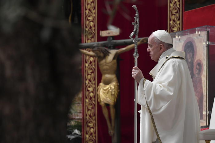 Per le disposizioni anti-coronavirus, la liturgia – trasmessa in diretta video – si svolge senza la partecipazione dei fedeli.