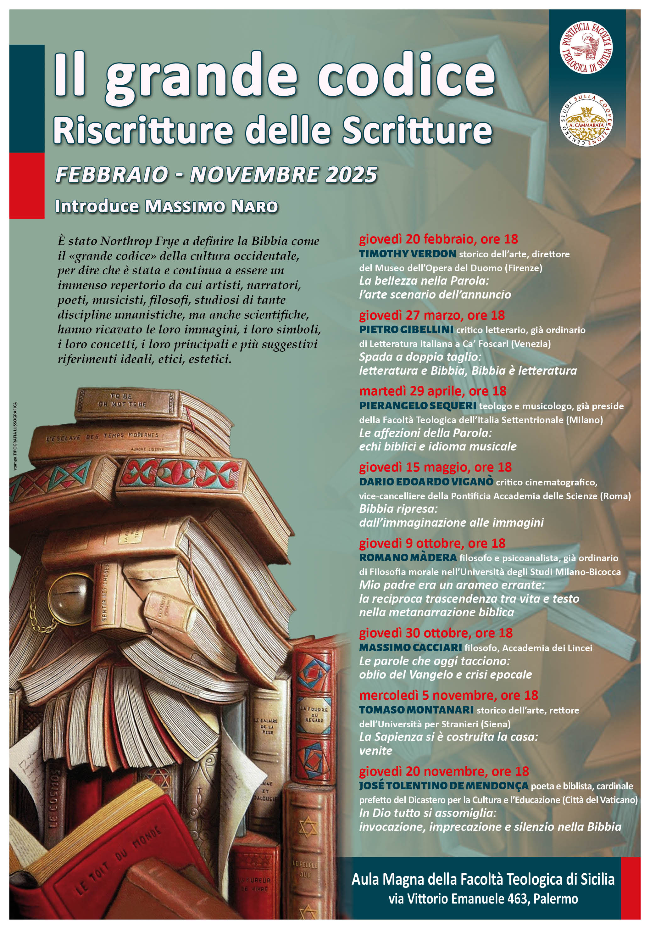 Dal 20 febbraio 2025, con inizio alle ore 18:00, sarà avviato un interessante Percorso culturale di 8 incontri dal titolo “Il grande codice: Riscritture delle Scritture bibliche nell’arco di quasi duemila anni”, promosso dalla Pontificia Facoltà Teologica di Sicilia insieme al Centro Studi Cammarata di San Cataldo, con il patrocinio dell’Assessorato Regionale dell’Istruzione e della Formazione Professionale.