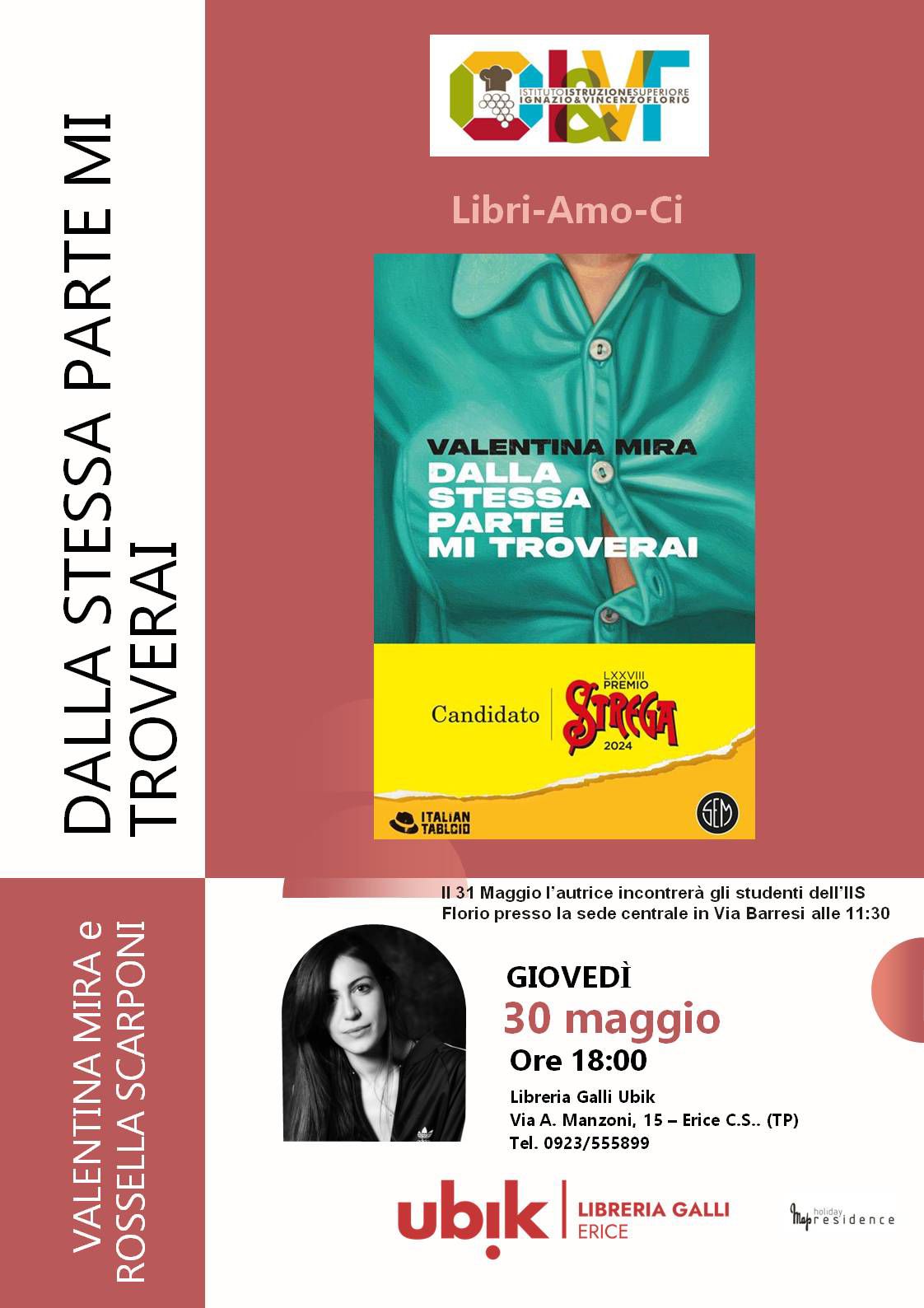 Ultimo incontro, per l’anno scolastico 2023/24, della Rassegna letteraria “LibriAmoCi – Incontro con l’Autore” organizzata dall’Istituto Superiore ‘Florio’ di Erice in collaborazione con la Libreria Galli Ubik-Erice. Si terrà con la consueta formula del doppio appuntamento: giovedì 30 maggio alle ore 18 per i lettori, alla Libreria Ubik, e venerdì 31 maggio alle ore 11.30 a scuola per gli alunni nella sede centrale di via Barresi. La protagonista sarà Valentina Mira, autrice del libro “Dalla stessa parte mi troverai”, incluso tra i dodici candidati al Premio Strega 2024.