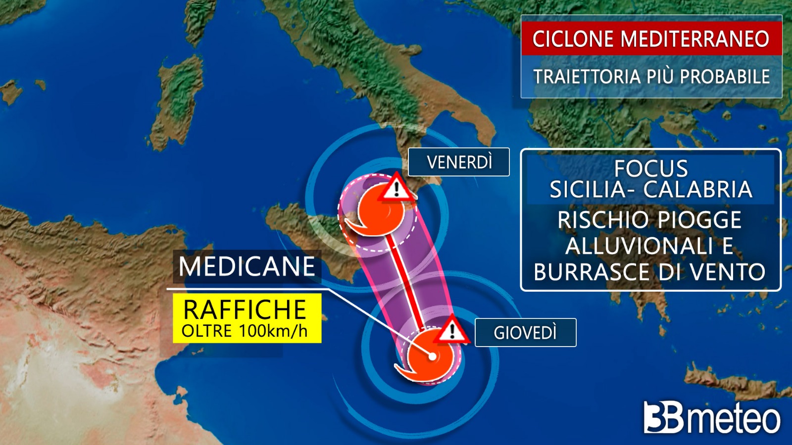 “La traiettoria ad oggi più probabile lo vede risalire lo Ionio giovedì e raggiungere l’area dello Stretto di Messina nel corso di venerdì. Pur con ancora qualche incertezza legata alla traiettoria esatta, in quando un sistema molto complesso e instabile, le aree maggiormente colpite dal severo maltempo saranno Sicilia ionica (siracusano, catanese, messinese specie ionico) e Calabria, specie reggino, locride, catanzarese. Su queste aree rischio piogge alluvionali con picchi talora superiori ai 150-200mm di pioggia e venti burrascosi sullo Ionio con raffiche oltre i 100km/h e mareggiate violente sulle coste esposte”.
