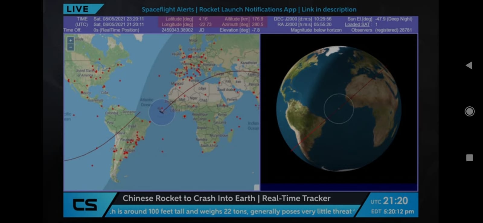 E’ previsto al momento sul Nord Atlantico il rientro del secondo stadio del razzo cinese Lunga Marcia 5B. Lo indica il sito Space-Track, sulla base dei dati del Comando di Difesa Aerospaziale del Nord-America (Norad). Diminuiscono, dunque, ancora di più, i rischi per la Sicilia.