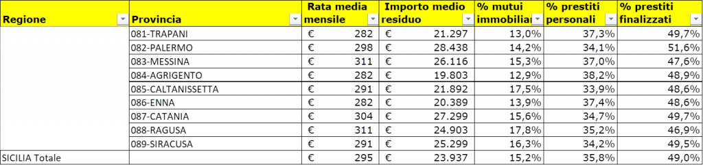 Ecco quanto riferito da Maurizio Liuti, Crif – Communication, Pr & Corporate relations director, circa la situazione in Sicilia e cosa deve sapere chi ha un debito e una sofferenza economica da fronteggiare: “Al 31 dicembre 2019 la rata media rimborsata dai siciliani con crediti attivi risultava pari a 295 €, mentre l’importo residuo da rimborsare per estinguere i finanziamenti in corso (inclusi i mutui immobiliari) era pari a circa 24.000 € (la Sicilia si colloca al penultimo posto nel ranking nazionale, sopravanzando la sola Calabria)”.