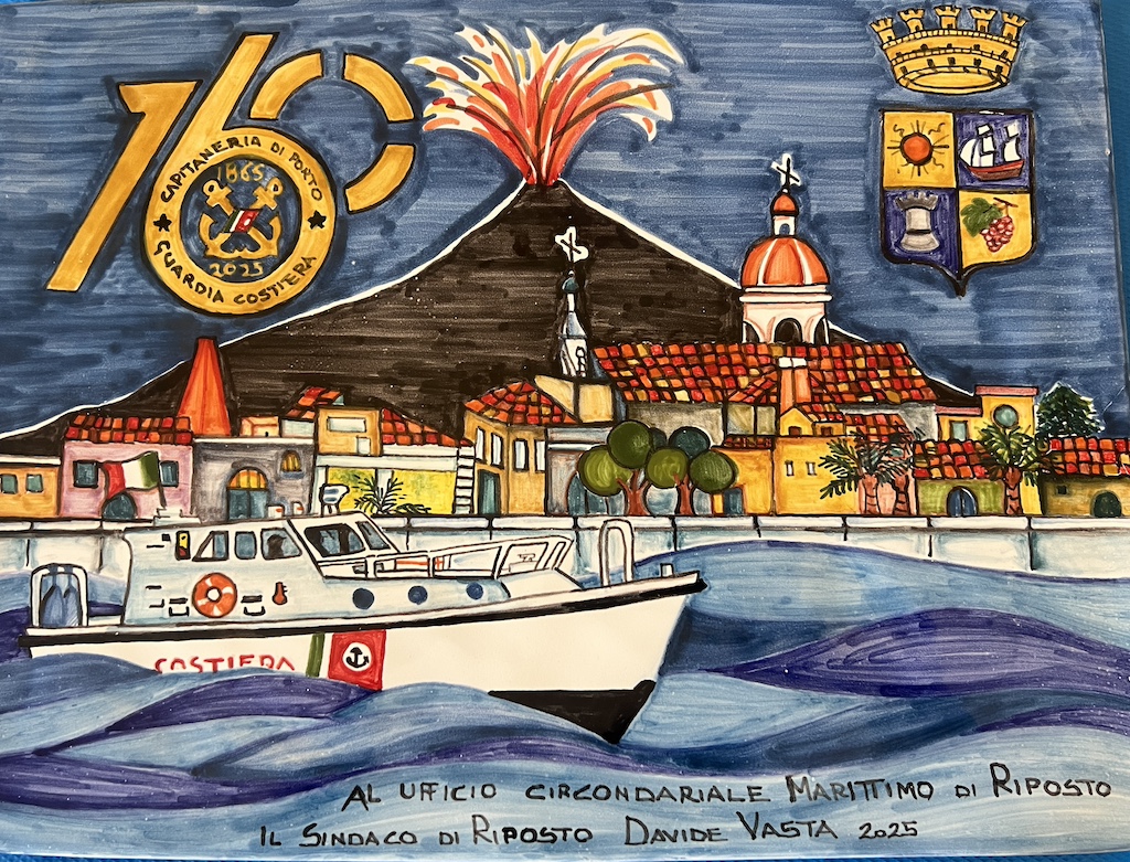 Questa mattina il sindaco di Riposto, Davide Vasta, ha consegnato un dono simbolico e significativo al neo comandante della Capitaneria di Porto di Riposto, Tenente di Vascello Arturo Laudato, in occasione dei 160 anni di istituzione del Corpo delle Capitanerie di Porto. Si tratta di una tavola in ceramica, opera dell’artista Niki Cilia, che raffigura la città di Riposto, con lo sfondo dell’Etna e con la motovedetta della Guardia Costiera in primo piano: un omaggio al ruolo fondamentale che la Capitaneria riveste nella tutela del mare, nella sicurezza dei cittadini e nella salvaguardia del patrimonio marittimo. Alla breve ma sentita cerimonia, svoltasi nella sala municipale del Palazzo di città, erano presenti anche il Luogotenente Mario Cardone e il Comune Scelto Debora Giacchetto, in forza alla sede ripostese.