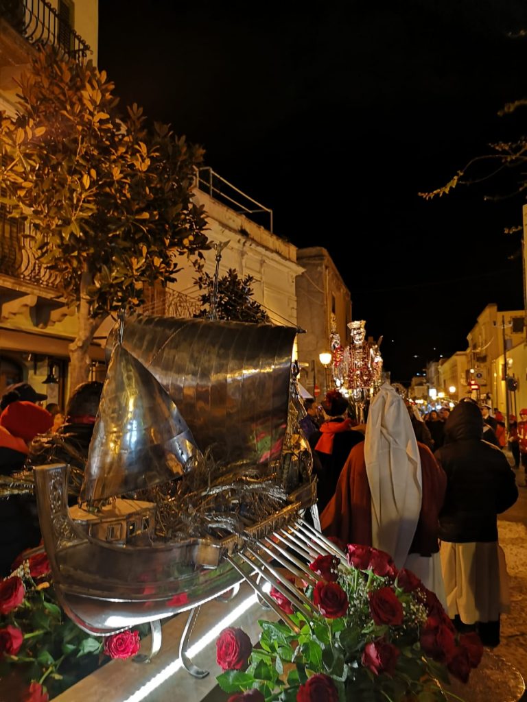 Dopo una messa solenne il simulacro argenteo, con le gambe nude, e il reliquiario a forma di nave detto vascidduzzu, vengono portati a spalla dagli adepti delle confraternite e la processione attraversa le lucide e strette stradine di Lipari fino a una chiesetta rustica in cui, si dice, furono conservate le prime reliquie dell’apostolo.