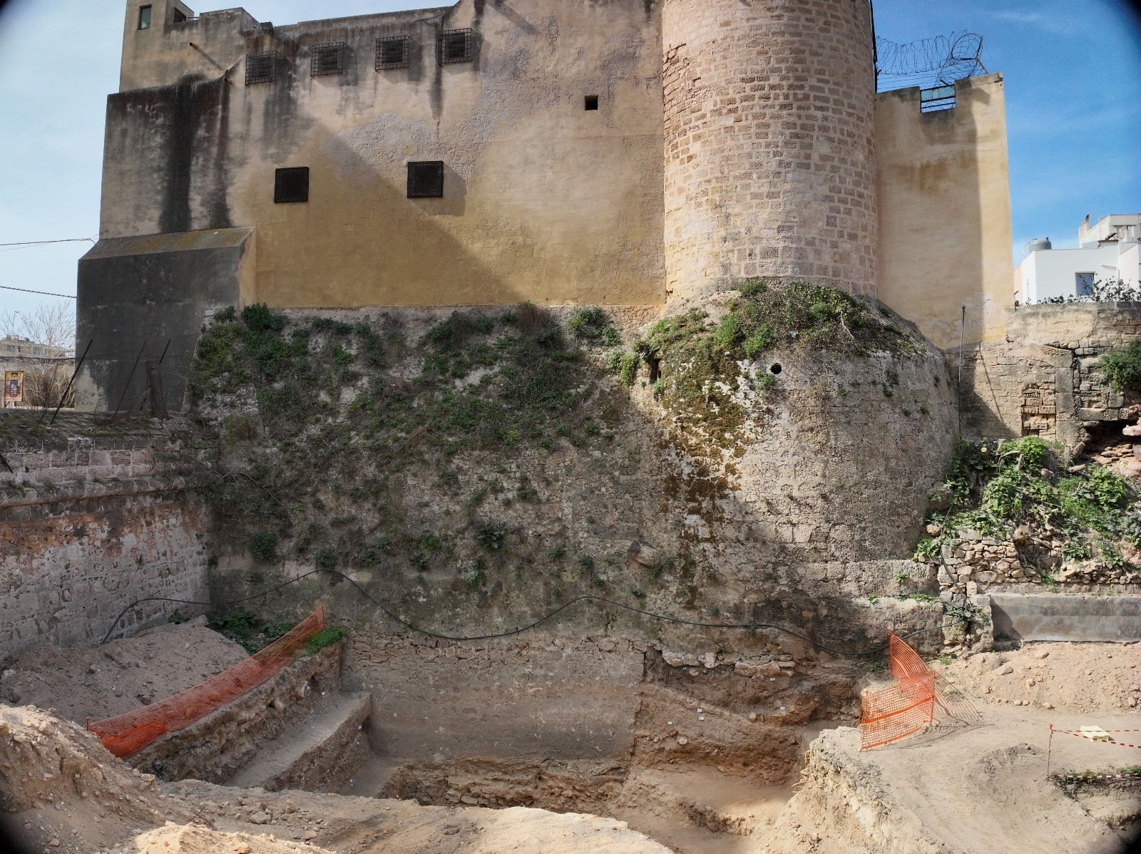 Un secondo saggio (SAS B) si sta conducendo nell’area del fossato sottostante il castello normanno-svevo, con l’obiettivo di raggiungere le fondazioni del muro di cinta compreso tra la torre circolare e la torre sud est. Lo scopo è di raggiungere la trincea di fondazione del castello, cercando così una conferma scientifica alla sua datazione, e nello stesso tempo verificare l’eventuale presenza di preesistenze relative a fortificazioni precedenti l’età medievale. Allo stato attuale dello scavo sono stati raggiunti gli strati relativi alla fase cinquecentesca, periodo nel quale viene costruito l’adiacente bastione di San Giacomo. I reperti restituiti sono, infatti, relativi a ciotole, scodelle e brocchette smaltate tardo e post medievali.