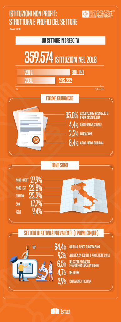 In generale, al 31 dicembre 2018 le istituzioni non profit attive in Italia sono 359.574 e, complessivamente, impiegano 853.476 dipendenti. Il numero di istituzioni non profit aumenta con tassi di crescita medi annui sostanzialmente costanti nel tempo (intorno al 2%) mentre l’incremento dei dipendenti, pari al 3,9% tra il 2016 e il 2017, si attesta all’1,0% nel biennio 2017-2018. Rispetto al complesso delle imprese dell’industria e dei servizi, l’incidenza delle istituzioni non profit continua ad aumentare, passando dal 5,8% del 2001 all’8,2% del 2018, diversamente dal peso dei dipendenti che rimane pressoché stabile (6,9%).