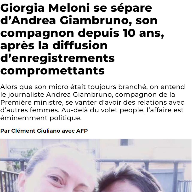“Dopo la diffusione di registrazioni compromettenti, Giorgia Meloni si separa da Giambruno, suo compagno da dieci anni”, titola l’edizione francese dell’Huffington Post, mentre Le Figaro sottolinea “la situazione imbarazzante per la leader ultraconservatrice, al potere da un anno e che si era presentata durante la campagna elettorale come ‘una madre cristiana’”.