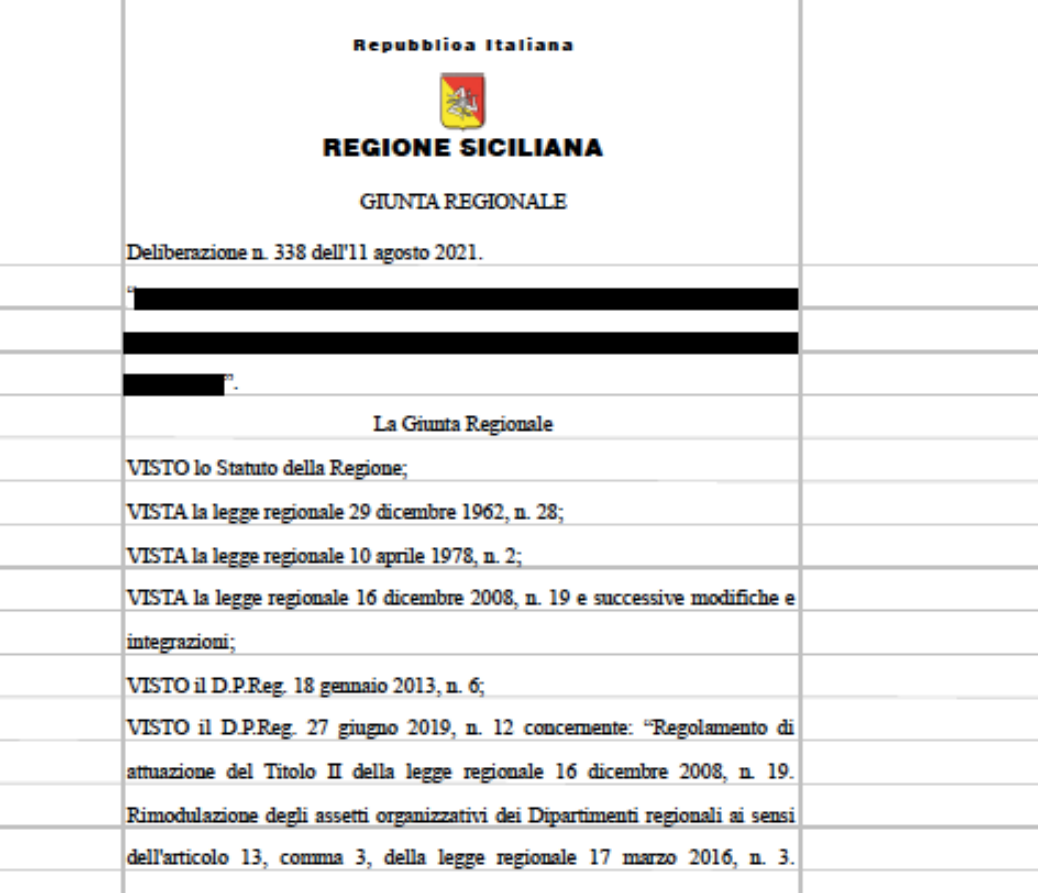 Mentre leggevo la delibera pubblicata sul sito della Regione vedo il richiamo con omissis ad un’altra delibera, la n. 338. Una classica delibera ferragostana, porta la data del 11 agosto. A questo punto incuriosito vado a leggere la delibera in questione sul sito. Ora voi mi direte ma a Ferragosto non hai un cabaso di lettino in spiaggia dove leggere la gazzetta dello sport? Notizie sul matrimonio di Marcel Jacobs, qualche post “munnezzaro” della Lucarelli? Bisogna essere proprio malati mi direte voi. E questo è probabile.