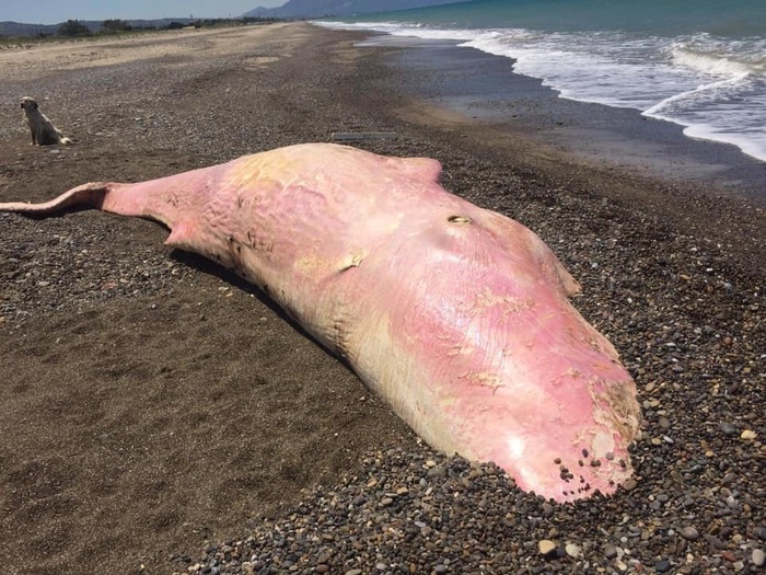 Si tratta della quinta carcassa di capodoglio trovata in Sicilia in una settimana (nella foto il capodoglio rosa spiaggiato a Lascari, nel Palermitano).