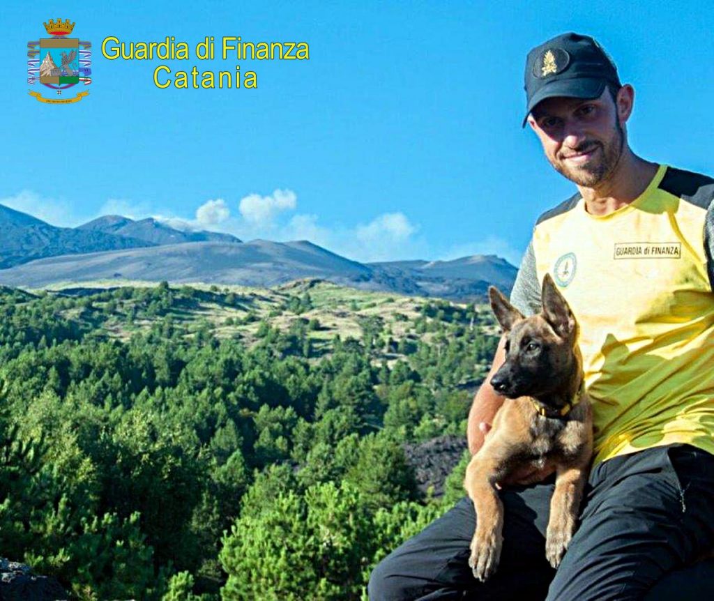 Non si tratta evidentemente di un bipede, bensì di una vivace cucciola di pastore belga di tre mesi, destinata a rinforzare, in un prossimo futuro, la squadra cinofili specializzata in Ricerca e Soccorso in servizio presso il Reparto del Corpo sulle pendici dell’Etna.